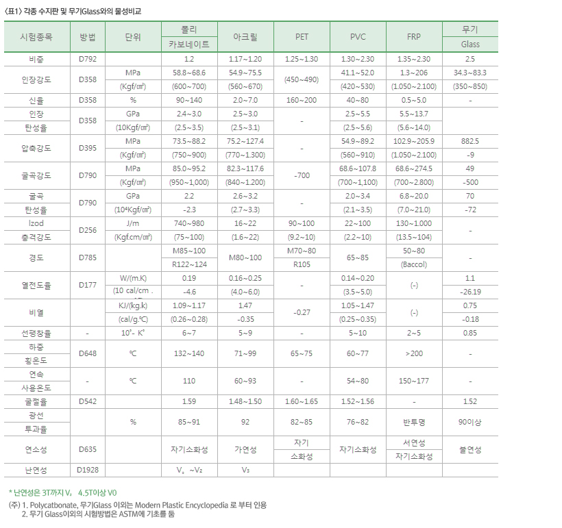 Polycarbonate와 다른 수지류와의 물성을 비교하여 보면 다음과 같은 특징이 있습니다.