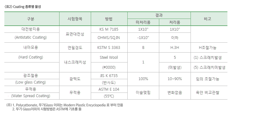 Polycarbonate의 표면강도는 기존의 폴리카보네이트 시트가 갖는 낮은 표면경도로 인한 표면찰과성이 크나 이러한 단점을 보완하여 Hard Costing에 의해 표면경도를 향상시키는 것이 가능합니다.