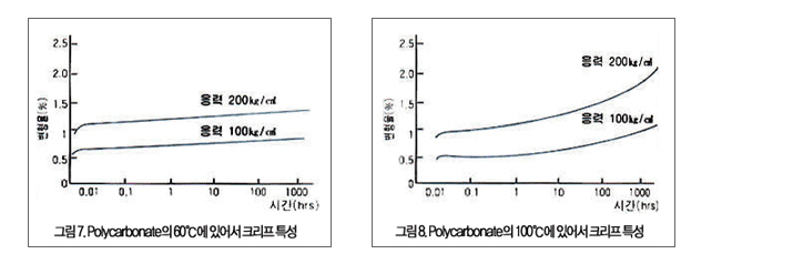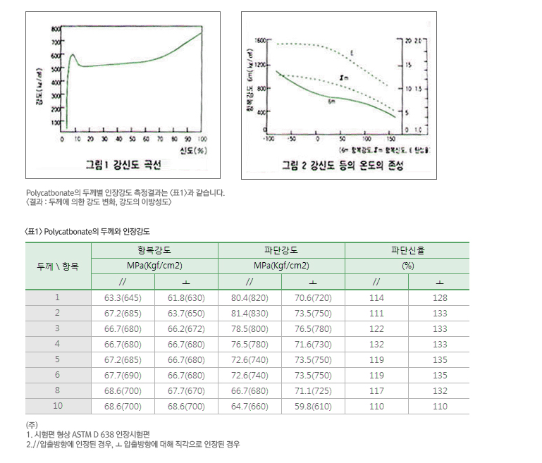 은 Polycarbonate를 각종 약품에 접촉시켰을 때의 외관 변화를 종합한 것으로 표 자료를 참고하여 사용에 주의하길 바랍니다. 특히 실내온도 60℃ 이상 상대습도 95% 이상의 수증기에 의한 폭로조건에서 연속사용은 화학적으로 붕괴를 초래하기 때문에 피하지 않으면 안 됩니다.