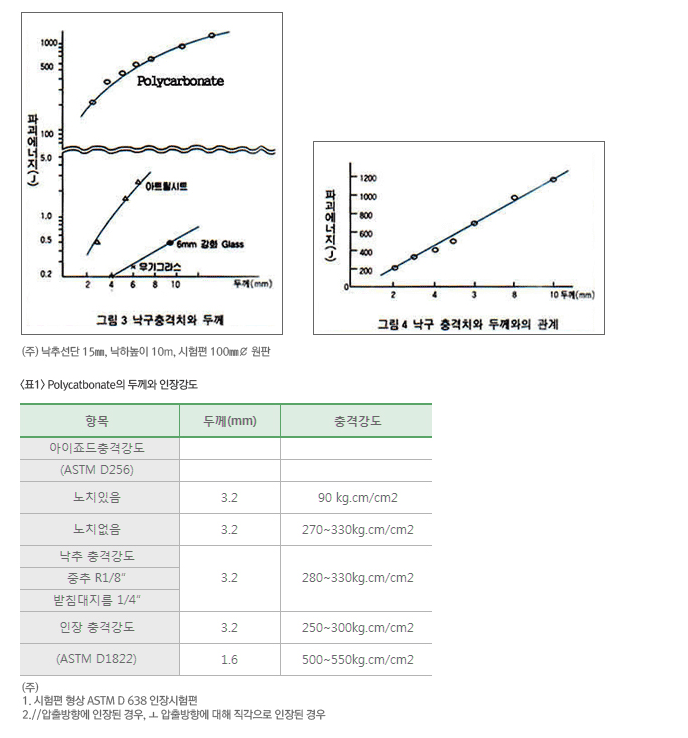 그러나 IZOD 충격시험에 의한 파괴상태는 시험편의 두께 6mm 부근에서의 연성파괴에서 취성파괴로 변하고 이에 따라 충격파괴 강도도 크게 변하므로 용도에 맞게 알맞은 두께의 선택이 필요합니다.