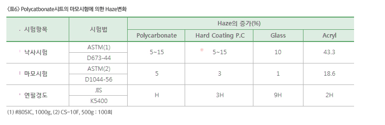 Polycarbonate의 표면강도는 기존의 폴리카보네이트 시트가 갖는 낮은 표면경도로 인한 표면찰과성이 크나 이러한 단점을 보완하여 Hard Costing에 의해 표면경도를 향상시키는 것이 가능합니다.