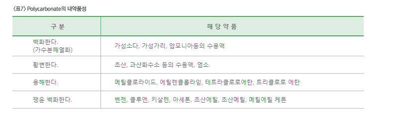은 Polycarbonate를 각종 약품에 접촉시켰을 때의 외관 변화를 종합한 것으로 표 자료를 참고하여 사용에 주의하길 바랍니다. 특히 실내온도 60℃ 이상 상대습도 95% 이상의 수증기에 의한 폭로조건에서 연속사용은 화학적으로 붕괴를 초래하기 때문에 피하지 않으면 안 됩니다.